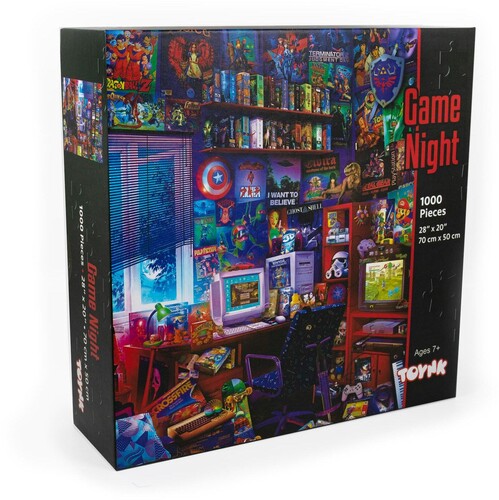 Full of fun references, the completed jigsaw puzzle features a bedroom decked out in '80s and '90s gear. The puzzle features artwork by acclaimed graphic designer Rachid Lotf. Known for his retro aesthetics, Rachid Lotf's stunning art brings a nostalgic touch to the millennial generation. Highlighting iconic imagery, you will reveal mementos of popular toys, TV shows, movies, video games, and much more.