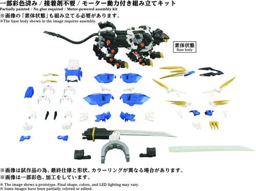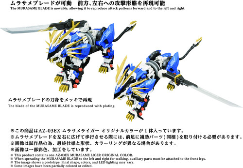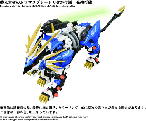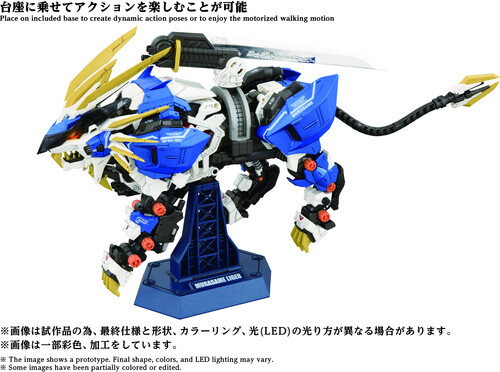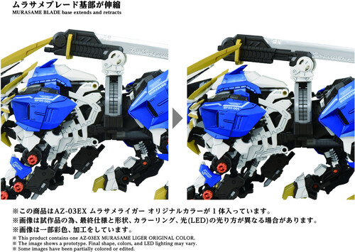 A 1/72 scale assembly kit. Activating the electric unit recreates realistic animal gait, with LED illumination in the eyes and chest. Parts like the pile bunker are manually movable. The Murasame Blade, the Murasame Liger's ultimate weapon, comes with both a plated version and a phosphorescent version for interchangeable use. The Murasame Blade freely moves forward, backward, left, and right. Its base features an extendable mechanism, further expanding posing possibilities.