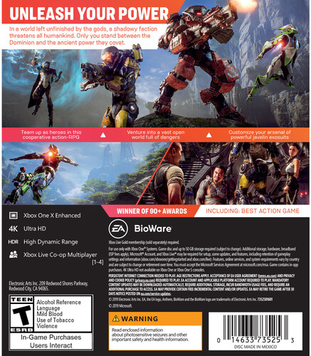 On a world left unfinished by the gods, a shadowy faction threatens all of humankind. The only thing that stands between these villains and the ancient technology they covet are the Freelancers. Join with up to three other players and assemble high-tech, hand-crafted, uniquely powerful exosuits. Explore vast ruins, battle deadly enemies, and claim otherworldly artifacts. With every mission, you and your Javelin exosuit grow in power. Fight the dangers of an ever-changing world. Rise united to defeat evil. Triumph as one. Anthem invites you to experience a co-operative Action-RPG set in a new and mysterious world from BioWare and EA.