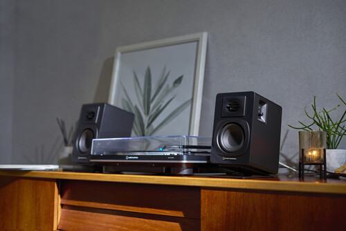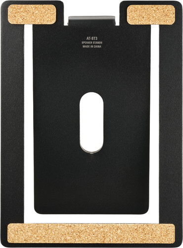 The AT-ST3 speaker stands position your AT-SP3X or other similarly sized bookshelf speakers for optimal sound projection. Made from rigid alloy steel with vibration-damping cork feet, each stand provides rugged support for a speaker weighing up to 3 kg (6.6 lbs). The stand’s speaker support surface is layered with urethane foam to further suppress unwanted vibrations and is angled at a shallow 13 degrees under the assumption that music will be enjoyed a short distance away from the speakers. The angle also