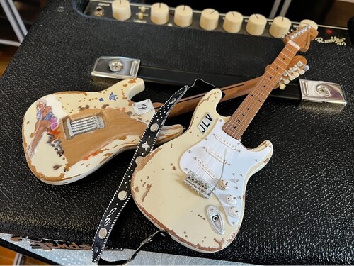 A must for fans of the acclaimed Fabulous Thunderbirds original guitarist from 1979 to 1989 & brother of Stevie Ray. This handmade axe details include a real metal mini "JLV" plate, vintage distressed detail, stars, girl, graphic on the back!