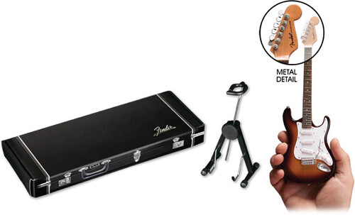 Each Fender™ by AXE HEAVEN® replica mini guitar model is approximately 10" in length and comes complete with a high-quality miniature adjustable A-frame stand and a Fender™ by AXE HEAVEN® guitar case gift box stamped with silver foil.