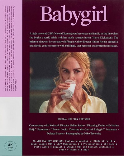 - Bonus features include Commentary with Writer & Director Halina Reijn, “Directing Desire with Halina Reijn” Featurette, “Power Looks: Dressing the cast of Babygirl” Featurette featuring Costume Designers Kurt & Bart, Deleted scenes, and BTS Photography by Niko Tavernise.