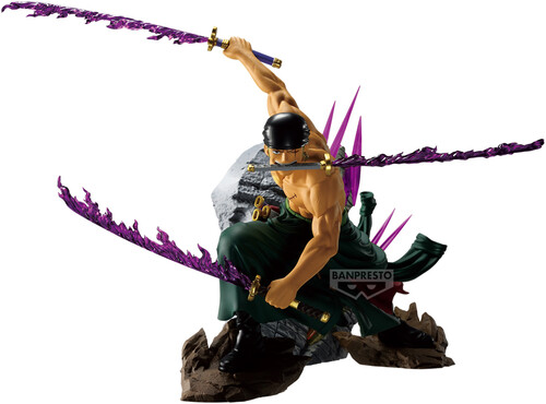 This collectible PVC figure depicts Roronoa Zoro in a dramatic attack pose from One Piece. Produced by Banpresto as part of the Theorama Soul collection, it features an integrated diorama‑style base that enhances its display presence.