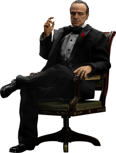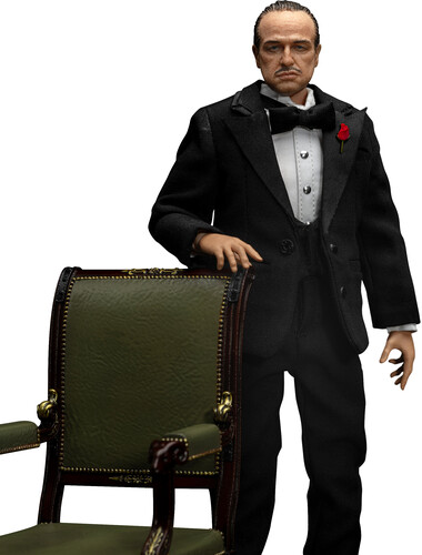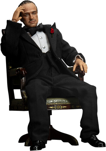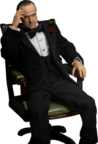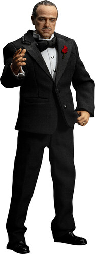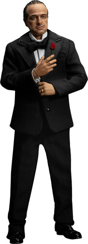 Using advanced 3D modeling and expert craftsmanship, this collectible figure faithfully recreates Vito’s most iconic look. He wears a tailored black suit made from real fabric, paired with a white shirt, black bowtie, and a red rose pinned to his chest—radiating a sense of quiet authority and elegance.