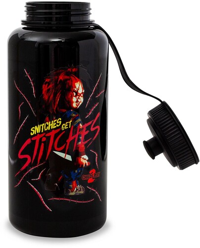 It's not all fun and games with this sports jug, featuring the sinister killer doll Chucky. Ready to bring more bloody mayhem, a knife-wielding Chucky sneers back on this black water bottle. Be thankful that this Good Guy doll is on your side, because "Snitches Get The Stitches" to anyone else that crosses Chucky's perilous path of destruction.