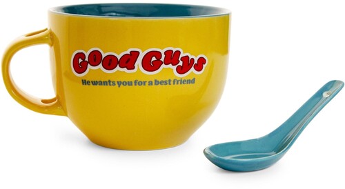 The menacing killer doll appears on the front in his trademark look, while the backside is emblazoned with the Good Guys slogan, "He Wants You For A Best Friend." The oversized mug is finished in the signature yellow and blue scheme, complete with a matching spoon that has Chucky's name printed on the back.