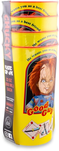 Be careful what you wish for. Chucky is here to satisfy your thirst for terror with this exclusive plastic cup set inspired by the horror cult classic Child's Play.