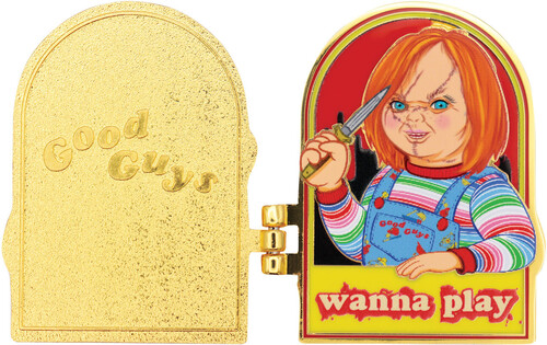 Featuring a special hinge function, the badge reveals Chucky’s sinister side, making it a truly interactive collectible piece. Created with an imitation gold plating and vibrant enamel colouring, this pin measures 45 x 33.4mm when closed, making it perfect for jackets, bags, or general display.