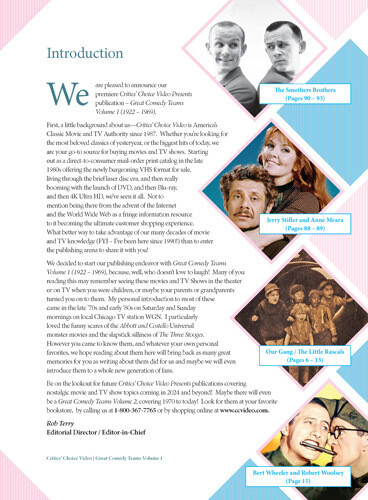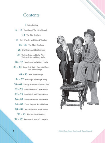 This premiere, first run issue of Critics' Choice Video Presents Great Comedy Teams Vol. 1 (1922-1969) was written and designed by the exact same team that produces the monthly Critics' Choice Video mail order catalogs. This Collectible Magazine, also known as a Bookazine, highlights the greatest Comedy Duos and Teams of all time. Subjects include Our Gang/The Little Rascals, The Ritz Brothers, Burt Wheeler and Robert Woolsey, The Marx Brothers, Ole Olsen and Chic Johnson, Thelma Todd and ZaSu Pitts, Thelma Todd and Patsy Kelly, Stan Laurel and Oliver Hardy, The Dead End Kids/East Side Kids/Bowery Boys, The Three Stooges, Bob Hope and Bing Crosby, George Burns and Gracie Allen, Bud Abbott and Lou Costello, Lucille Ball and Vivian Vance, Dean Martin and Jerry Lewis, Doris Day and Rock Hudson, Jerry Stiller and Anne Meara, The Smothers Brothers and Dan Rowan and Dick Martin. Learn the history of these great comedy teams and duos and how they continue to influence movies, television shows and popular culture all the way through the present day. Filled with great articles and hundreds of rarely seen photograph. 100 pages. Paperback. Perfect bound. 8" x 11"