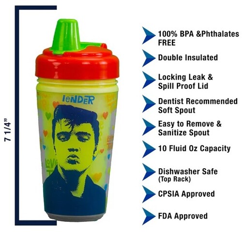 You and your rockin' baby can celebrate the king himself, Elvis Preseley with this Love Me Tender Sippy Cup.