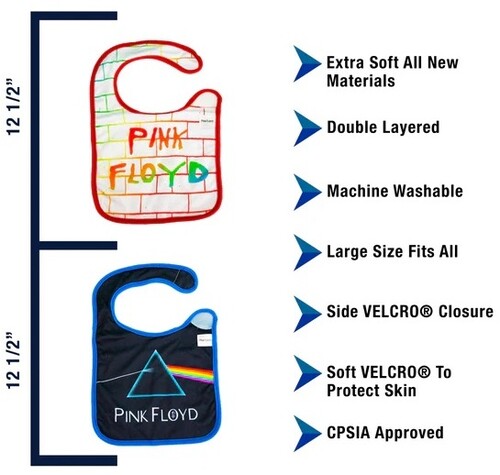 Style Matters! Keep your little ones clean and cool with these exclusive Pink Floyd bibs by Daphyl’s, featuring imagery of The Dark Side of the Moon and The Wall Logos.