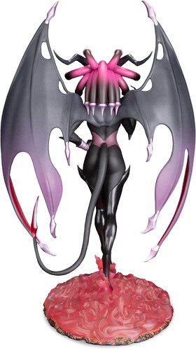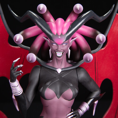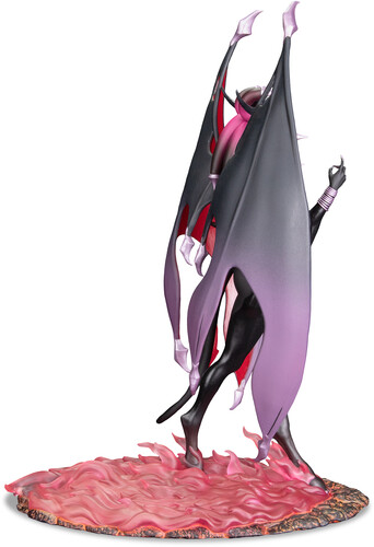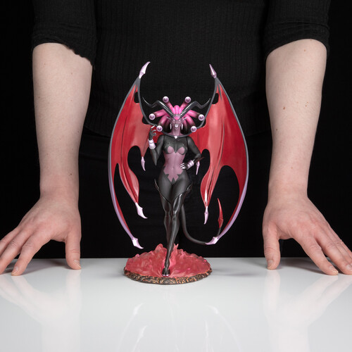 Sauntering in sadistic glee, Drolta stands at an imposing 11.25” tall from the tip of her taloned wings down to the flaming base. With her unfurled wings and flaming catwalk of a base, she is 5.5” wide and 6” deep.