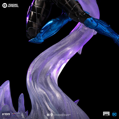 Flying in high speed, boosted by energy explosions from a jet engine on his back, the young, armored hero reaches greater maneuverability thanks to a pair of insect-like translucent wings. Wearing an extraterrestrial costume capable of reconfiguring itself to create a wide array of tools and weapons; a pair of pincers in the shape of small claws come out of his shoulders, protecting his head and back; while his right arm takes the form of big claws just like a scarab, his left arm becomes an energy blaster cannon, shooting rays against his enemies. With combat fury in his countenance, Iron Studios present the statue "Blue Beetle - DC Comics series #8 - Art Scale 1/10", with the armored hero with his blue and black armor described both as a technological artifact and a living entity.