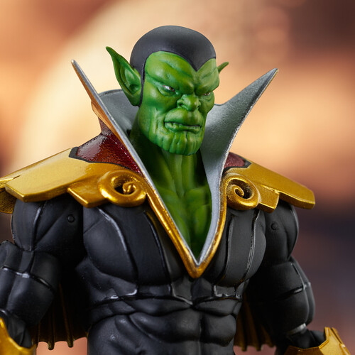 Never before made as a toy, this green-skinned Skrull comes dressed in an Illuminati-inspired outfit, and includes an interchangeable masked head, as well as interchangeable hands and a devastating Black Bolt sonic attack piece!
