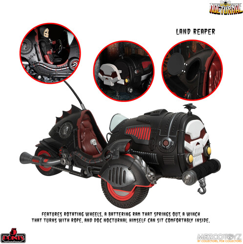Land Reaper - Doc Nocturnal’s tri-wheeled terror of the roadways! The Land Reaper includes a spring loaded battering ram, working winch, free rolling wheels, and secret storage.