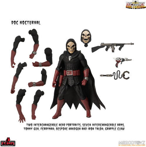 Doc Nocturnal – the Phantom Knight of New Providence who eradicates creatures of the night, featuring two interchangeable head portraits, seven interchangeable arms, and a collection of weapons including a tommy gun, The Ferryman, and The Iron Talon.