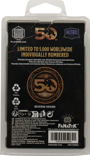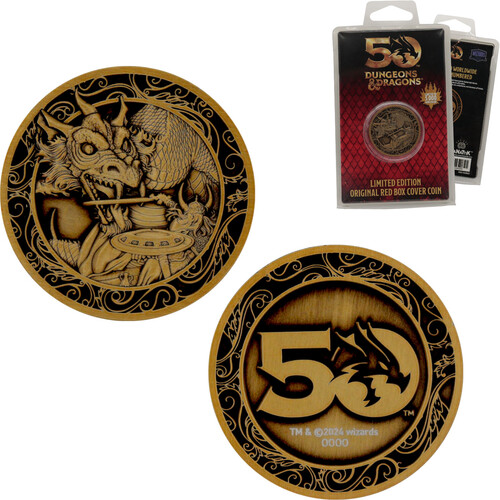 Celebrating the 50th anniversary of the most important RPG to ever have existed, this limited edition antique gold coin is heavily embossed with the design from the original basic rules set and is individually numbered as one of 5,000 worldwide.