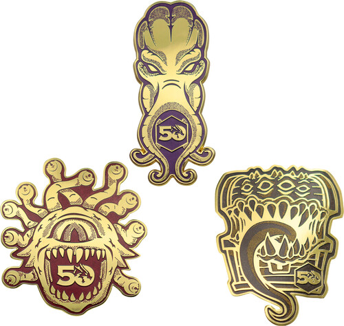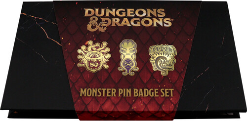 Showcasing three of the most iconic monsters from the first half-century of its existence, this Dungeons & Dragons set of three pin badges features a Beholder, a Mind Flayer, and a Mimic, all finished in antique gold with coloured detail. Limited to 1,974 (referencing the year D&D was introduced), each display box is individually numbered.