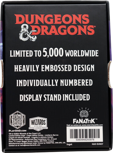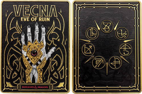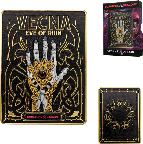 Team up across timelines, worlds, and universes to build the Rod of Seven Parts and defeat this deadly being. Featuring Vecna’s infamous hand heavily embossed into its face, this collectible metal ingot is finished with detailed antique gold and black enamel touches.