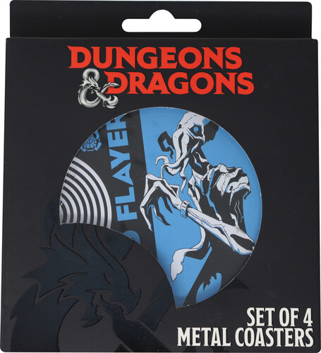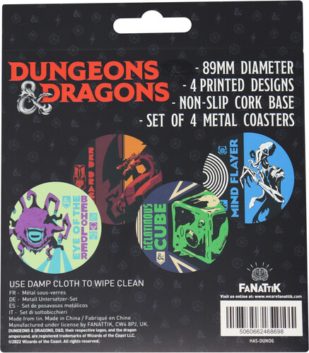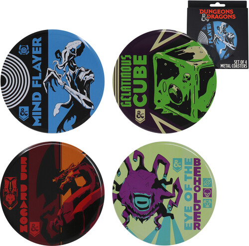 This set of 4 printed metal Dungeons & Dragons coasters features 4 embossed designs: Mind Flayer, Gelatinous Cube, Red Dragon and The Eye of the Beholder.