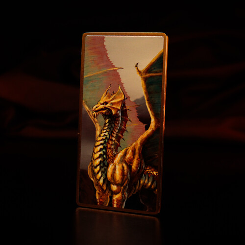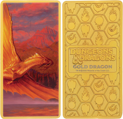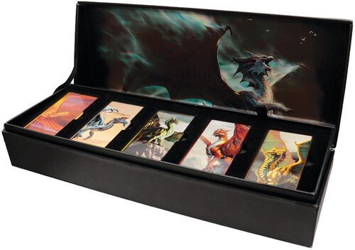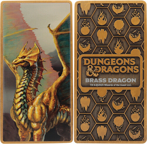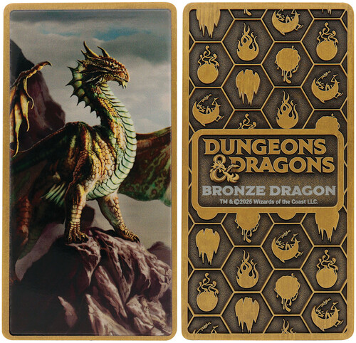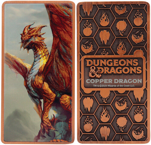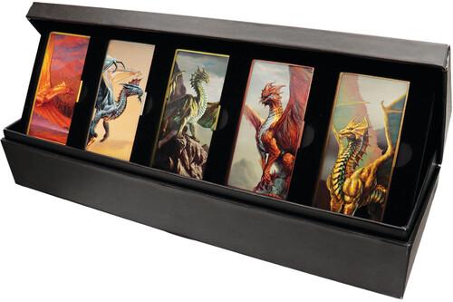This limited edition set includes Gold, Silver, Bronze, Copper, and Brass dragons, each represented by its own intricately detailed metal ingot. Every piece features a double-sided design with richly detailed artwork inspired by classic D&D lore, giving the set a striking display.
