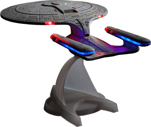 The Enterprise D sits atop a new smokey black transparent stand shaped like the Star Trek TNG Combadge. It can be easily separated from the base for a quick flight around the house, or the galaxy, when no one is looking.