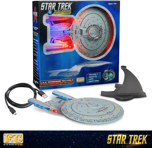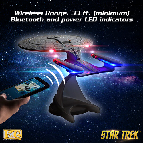 The FAMETEK™ Enterprise D Bluetooth Speaker delivers a powerful music experience in a show accurate model. We take pride in our attention to cosmetic detail, great sound quality and fun features. Enterprise 1701-D Bluetooth sit as focal point in any collection, office, or living space. A must have collectable for Star Trek fan looking for a practical experience. Music beaming out of the Enterprise D will likely prove the envy of any crewmates wandering down the corridor.