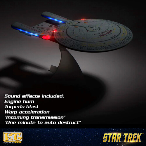 The Enterprise D sports 5 sound effects, including warp drive, photon torpedoes firing, engine hum, and auto destruct. Majel Barrett Roddenberry voices the incoming transmission sound. A simple tap on the bridge button invokes sound effects any time. Retailer packing makes the sound effects available for in-store demo’s.