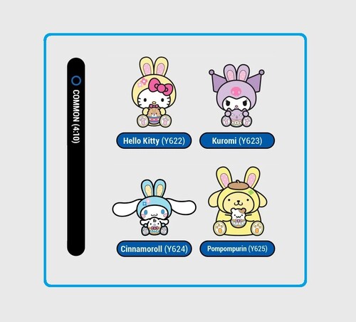 - Common: Hello Kitty (Y622), Kuromi (Y623), Cinnamoroll (Y624), Pompompurin (Y625)