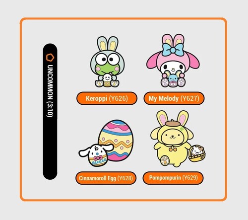 - Uncommon: Keroppi (Y626), My Melody (Y627), Cinnamoroll Egg (Y628), Pompompurin (Y629)