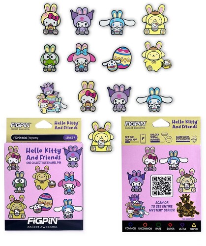 FiGPiN's Hello Kitty® Mystery Mini Series 7 features Easter themed designs of Hello Kitty and Friends. Discover a spring-filled collection of enamel pins with characters like Hello Kitty, Cinnamoroll, Pompompurin and more! Each Mystery Mini is enclosed in a blind box and you can find a randomized character inside. Complete your collection and download the FiGPiN APP to redeem the ultra rare Easter Egg, a black and gold-plated enamel pin with only 100 made!