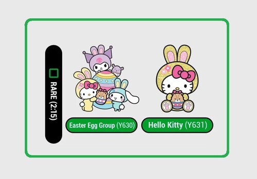 • Uncommon: Keroppi (Y626), My Melody (Y627), Cinnamoroll Egg (Y628), Pompompurin (Y629)