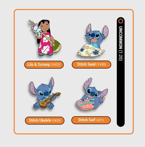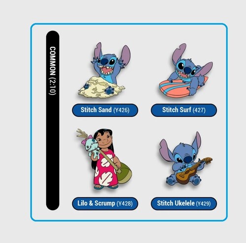 - Uncommon (Glitter Variants): Stitch Sand (Y430), Stitch Surf (Y431), Lilo & Scrump (Y432), Stitch Ukelele (Y433)