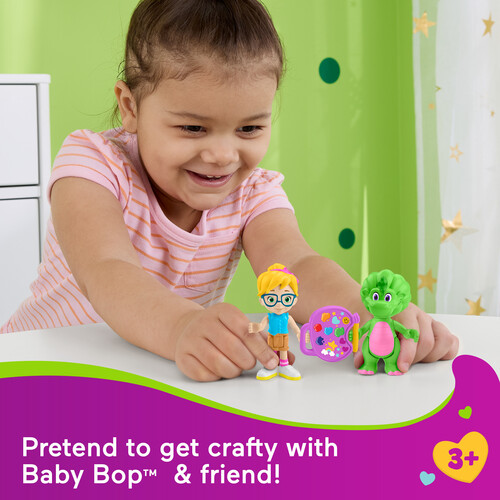 - Includes poseable Baby Bop and Barney’s Friend Vivie figures, plus a paint palette accessory piece