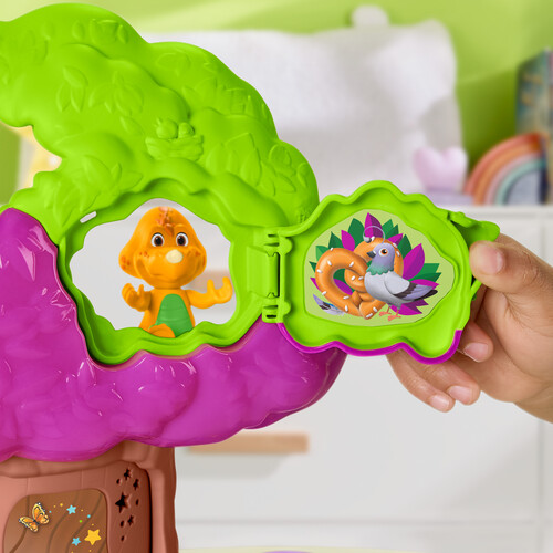 - Slide open the door on the tree trunk to “magically” reveal Barney with lights and sounds, just like on the show; includes Barney & Billy the Dino figures plus pretzel play piece