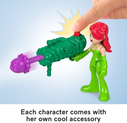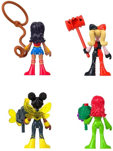 - Includes 4 poseable characters: Wonder Woman, Bumble Bee, Harley Quinn and Poison Ivy, each with her own matching accessory