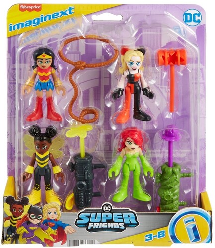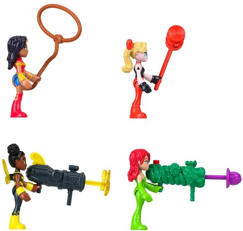 This 8-piece figures and accessories set features 4 poseable characters, including Wonder Woman, Bumble Bee, Harley Quinn and Poison Ivy, each with her own matching accessory for action-packed battles.
