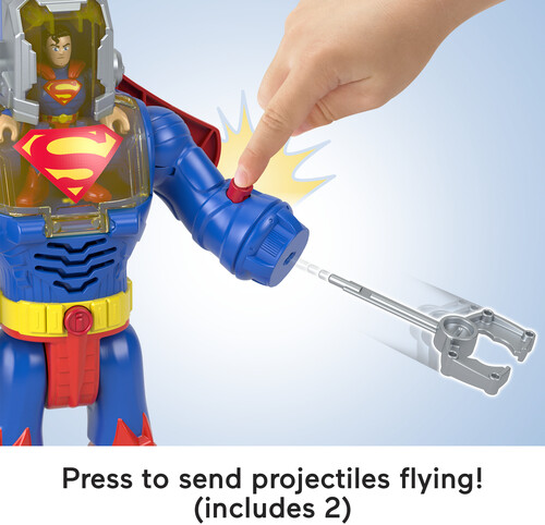 When bad guys start wreaking havoc in Metropolis™, the Man of Steel™ launches into action with his Exo Suit. Kids can place the poseable Superman™ figure inside the Exo Suit cockpit then use the Power Pads to bring the rescue action to life with awesome lights, sounds and projectile-launching action!