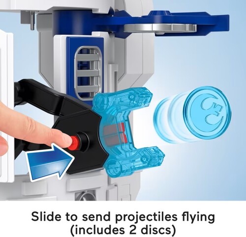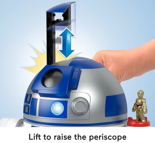 - Hands-on play: roll the droid along on wheels, send projectiles flying from the launcher, spin the pretend blade, and lift the elevator on the back to raise periscope