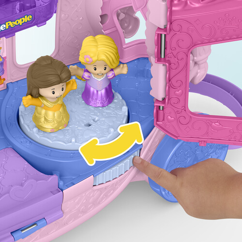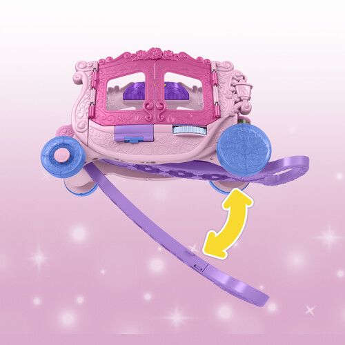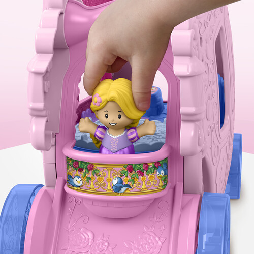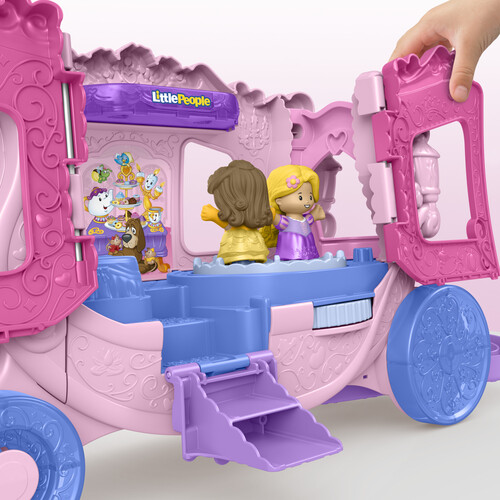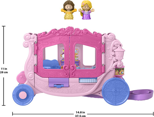 Styled like a classic horse-drawn carriage, this toy vehicle opens to reveal a decorative playset with Disney Princess-inspired music and sounds plus multiple play areas where kids can act out stories with Disney Princess Belle and Rapunzel figures.