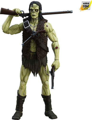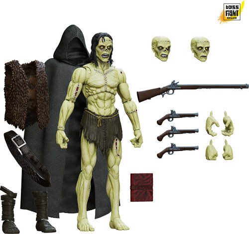 This enormous 7.5 inch figure includes three interchangeable heads, three pairs of interchangeable hands, rifle, three flintlock pistols, fur vest, bandolier, leg wraps, two sets of interchangeable feet, Frankenstein’s journal and softgoods cloak.