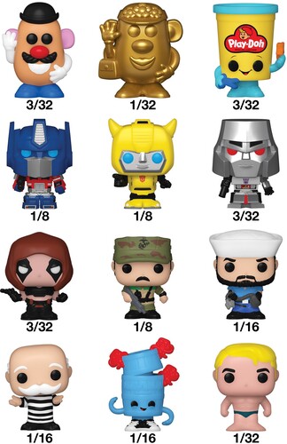 Your favorite Retro Toy Pops! have been shrunk into Bitty Pops! Expand your collection with this assortment of Bitty Pop! figures featuring your most beloved toys as miniaturized figures! Each Bitty Pop! comes in mystery packaging and includes one collectible figure. Who will you find? There’s Bitty Pop! Mr. Potato Head, Bitty Pop! Mrs. Potato Head, Bitty Pop! Play-Doh Container, Bitty Pop! Optimus Prime, Bitty Pop! Bumblebee, Bitty Pop! Megatron, Bitty Pop! Zartan, Bitty Pop! Leatherneck, Bitty Pop! Shipwreck, Bitty Pop! Mr. Monopoly, Bitty Pop! Barrel of Monkeys, and Bitty Pop! Stretch Armstrong.