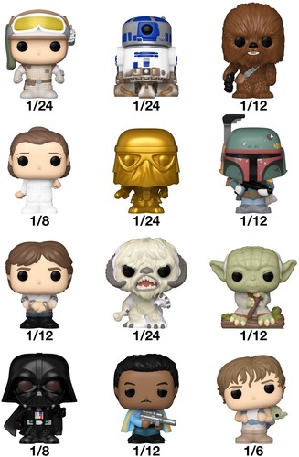 The world of POP! is getting bigger—and smaller—with Bitty POP! collectibles! Expand your Star Wars™ collection with this exclusive assortment of Bitty POP! collectibles featuring some of your favorite characters from Star Wars: The Empire Strikes Back™! Each Bitty POP! comes in mystery packaging and includes one collectible figure. Who will you find? There’s Bitty POP! Luke Skywalker™ (Hoth™) (1/24), Bitty POP! R2-D2™ (1/24), Bitty POP! Chewbacca™ (1/12), Bitty POP! Princess Leia™ (1/8), Bitty POP! Snowtrooper™ Gold (1/24), Bitty POP! Boba Fett™ (1/12), Bitty POP! Han Solo™ (1/12), Bitty POP! Wampa™ (1/24), Bitty POP! Dagobah Yoda™ (1/12), Bitty POP! Darth Vader™ (1/8), Bitty POP! Lando Calrissian™ (1/12), and Bitty POP! Luke Skywalker™ and Yoda™ (1/6).