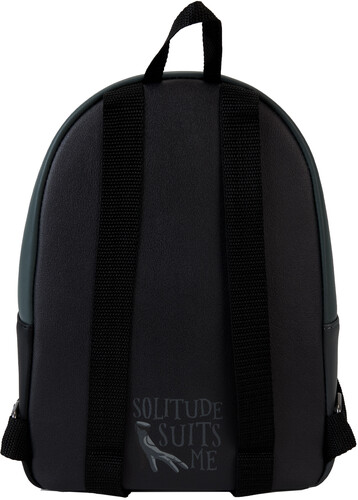 Stroll the halls of Nevermore Academy in style with the Wednesday Funko Mini Backpack! The front pocket of this black and grey mini backpack features POP! Wednesday Addams performing a cello solo, illuminated by her dormitory window. This eerie accessory has plenty of room for holding all of your belongings whether you are on your way to class or picking up a new extracurricular! Backpack is made of vegan leather (polyurethane) and has adjustable shoulder straps. Additional features include sturdy metal hardware and printed details. This backpack is an officially licensed Wednesday product. Approximate dimensions: 8.25” W x 10.75” H x 4” D. (Please note: width is measured across the bottom of the bag.)
