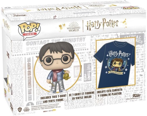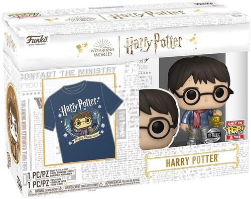 This stylized Harry Potter Christmas Metallic Funko Pop! Vinyl Figure #122 and Adult Funko Pop! T-Shirt 2-Pack includes 1x Harry Potter Funko Pop! Vinyl Figure #122 and 1x Adult Pop! T-Shirt. The Pop! Vinyl Figure measures approximately 3 3/4-inches tall. This Pop! and Tee bundle comes packaged in a stylized box.