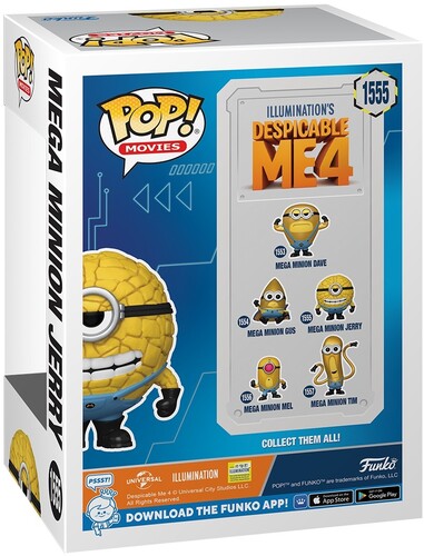 Go BANANAs with Jerry! The Minions from Disney Pixar's 2024 animated film Despicable Me 4 are stepping up their game to take on a new supervillain and, of course, cause shenanigans. Bring home Mega Minion Jerry to embrace the excitement and laughs of your favorite movie moments in your Funko Pop! collection! This Despicable Me 4 Mega Minion Jerry Funko Pop! Vinyl Figure #1555 measures approximately 3 1/4-inches tall and comes packaged in a window display box. For ages 3 and up.