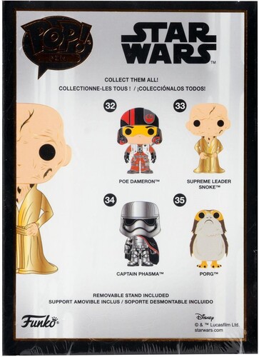 Expand your Pop! style with Funko Pop! Pins! This large Pop! Pin measures approximately 4-inches tall, just like the Pop! Vinyl Figure it's based on. Not only does the pin have the standard pin backings so you can attach it to bags or a cork board; it also has a "Funko Crown" pin stand allowing it to stand up for a dynamic display! True to it's namesake, the head is raised making it pop from the body. This Star Wars Supreme Leader Snoke Large Enamel Funko Pop! Pin #33 comes packaged in a window display box. For ages 6 and up.