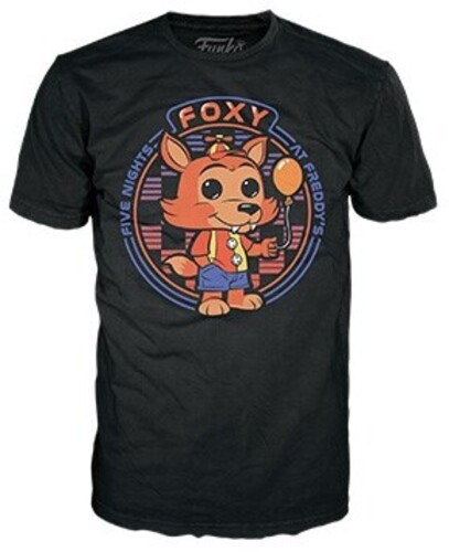 Close in on your favorite Five Nights at Freddy’s™ in comfort and style with this Balloon Foxy Pop! Tee. The front of this short-sleeved tee features Pop! Balloon Foxy against a red and blue background with phrases “Five Nights at Freddy’s” and “Foxy” printed in clean lettering around him. This black crew neck tee is paired with flocked Pop! Balloon Foxy. Bring Pop! Balloon Foxy along as you wear this tee on your next adventure and show off your Five Nights at Freddy’s pride in your collection and on the go! Catch this Five Nights at Freddy’s Pop! & Tee set before it moves! Vinyl figure is approximately 3.75-inches tall.