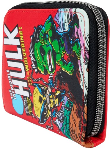 Sink your claws into the Wolverine 50th Anniversary Comic Action Funko Wallet! This stylish wallet features Pop! Hulk and Pop! Wolverine from the cover of The Incredible Hulk #181 against a striking red background. This vibrant accessory will keep your belongings safe as you embark on your next heroic adventure! Features: Vegan leather (polyurethane) Zips closed Gunmetal hardware Printed details 1 clear ID holder 4 card slots Dimensions: 5” W x 4” H This is an officially licensed Marvel product.